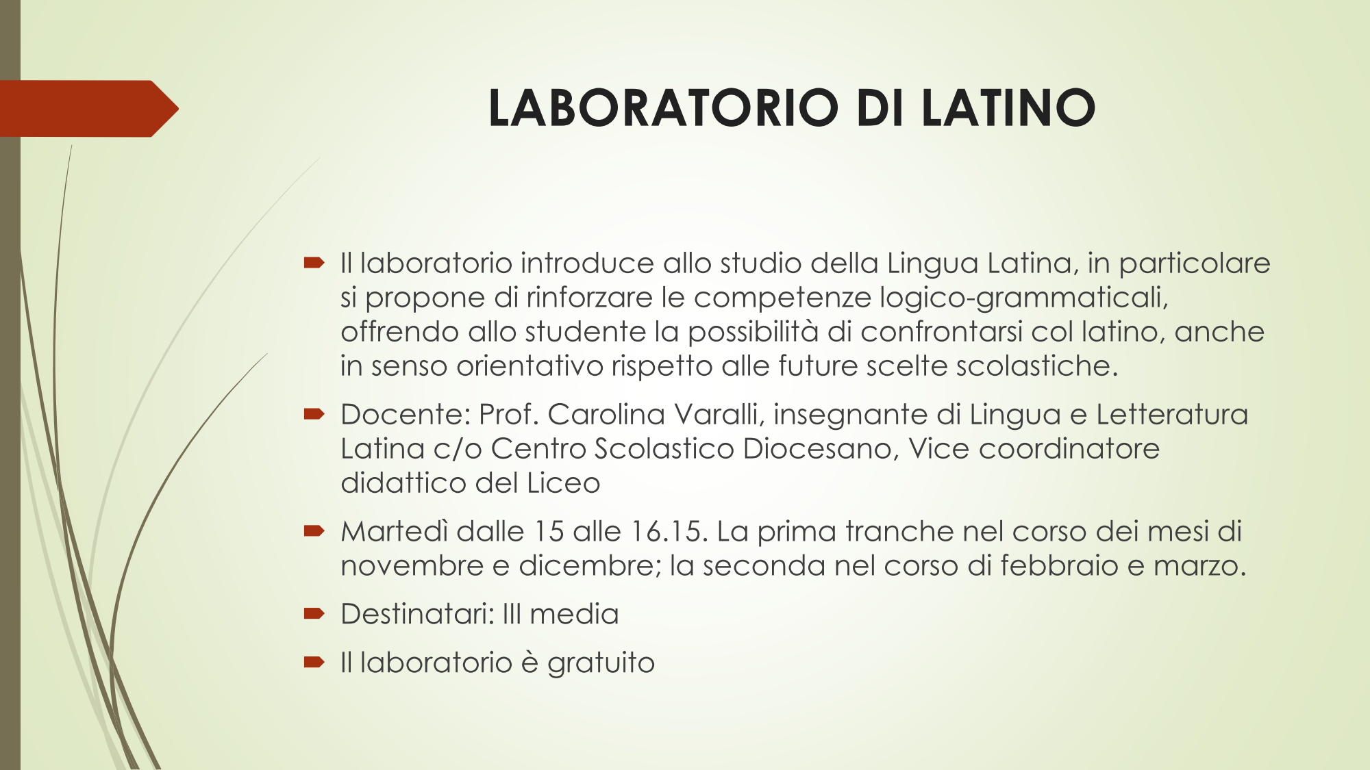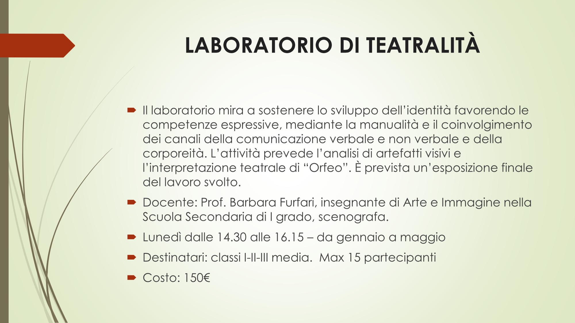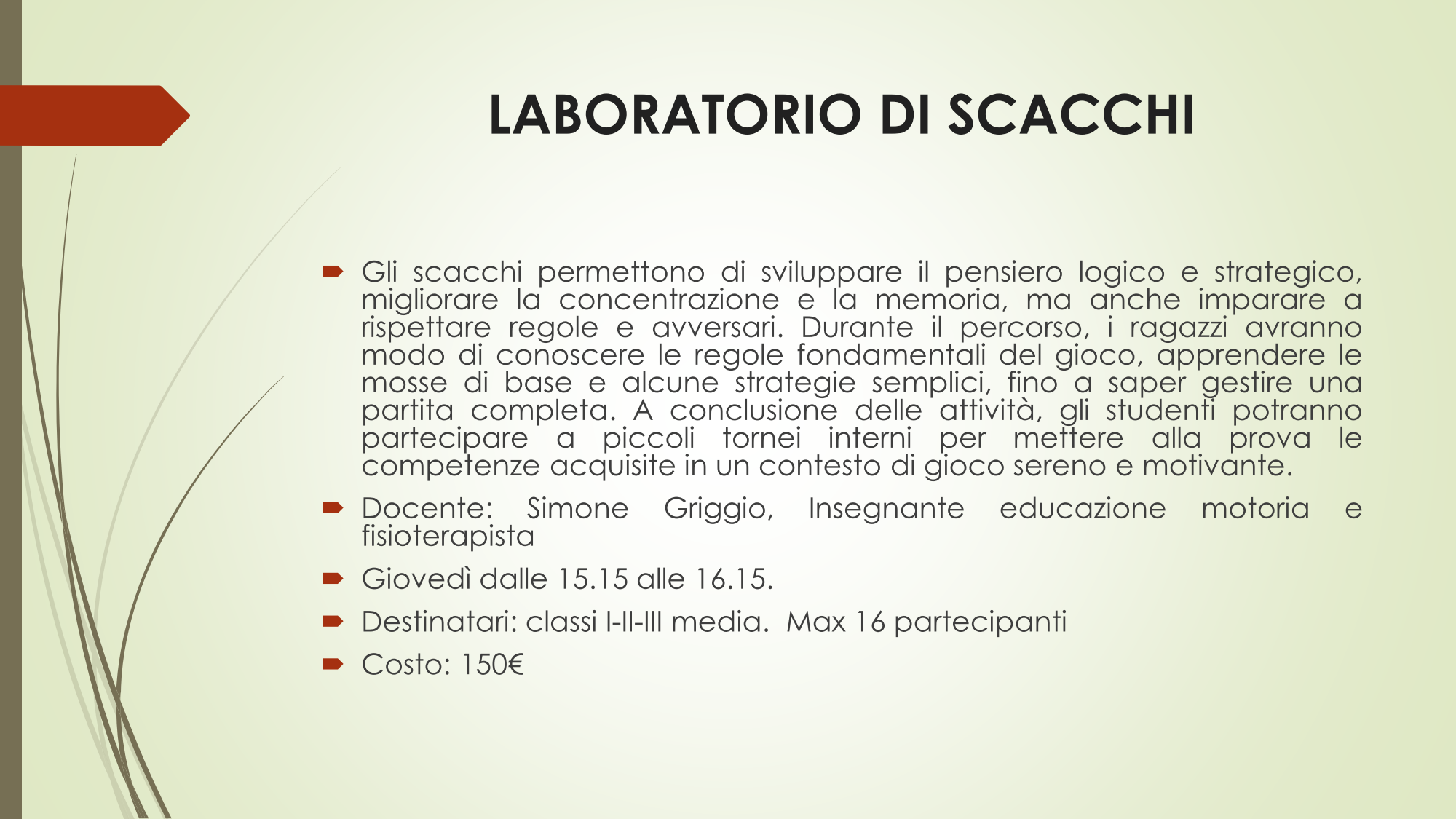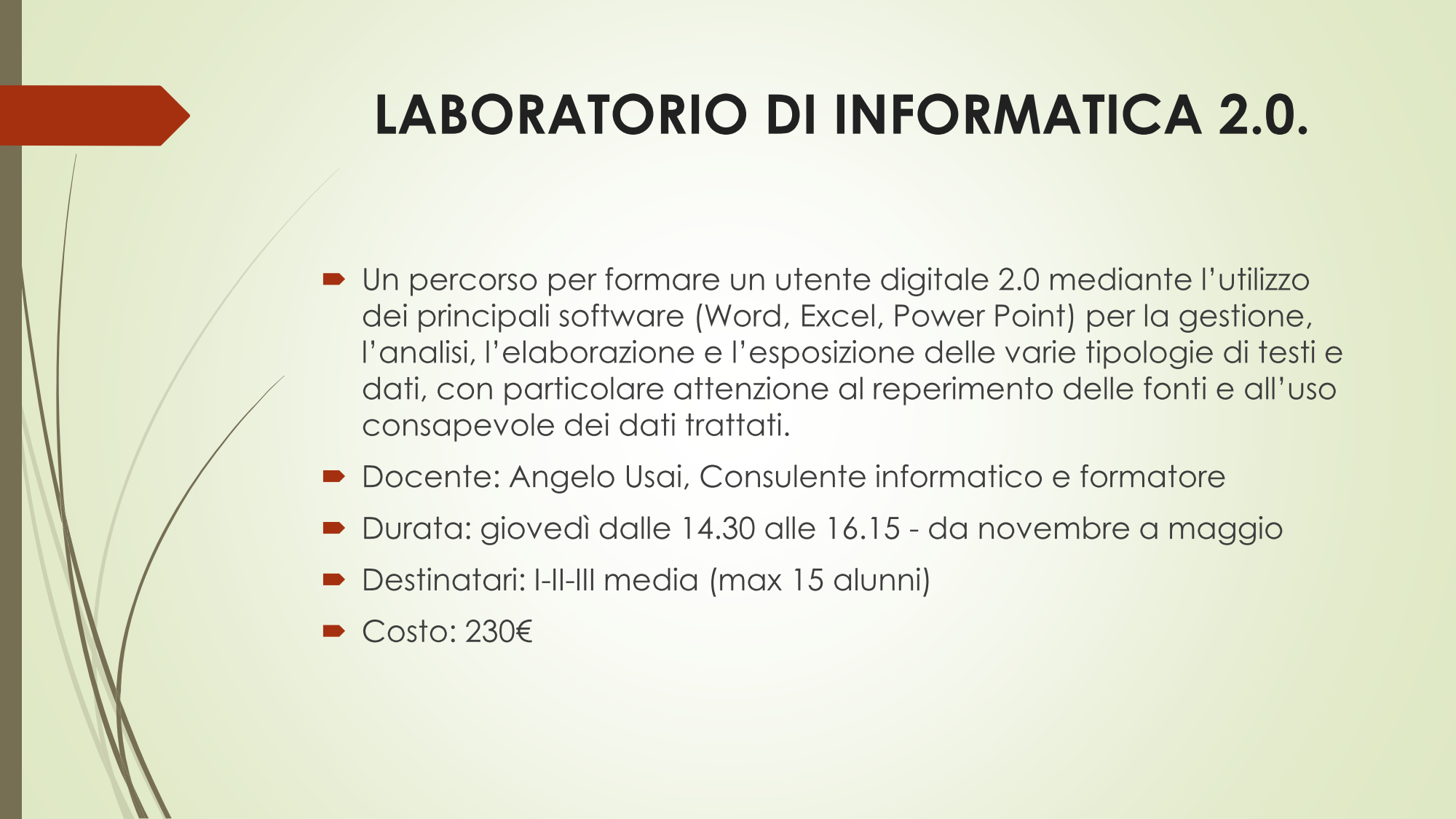 Per tutte le informazioni sui laboratori pomeridiani della scuola media, potete scorrere le immagini a seguire oppure cliccare qui per sfogliare e/o scaricare la versione pdf.