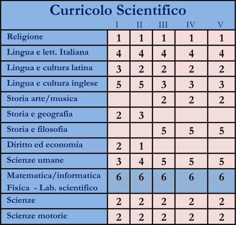 Valorizza lo studio del nesso tra cultura scientifica e tradizione umanistica e guida all’acquisizione delle conoscenze e dei metodi propri della matematica, della fisica e delle scienze naturali. Guida lo studente ad approfondire e a sviluppare le conoscenze e le abilità e a maturare le competenze necessarie per seguire lo sviluppo della ricerca scientifica e tecnologica.