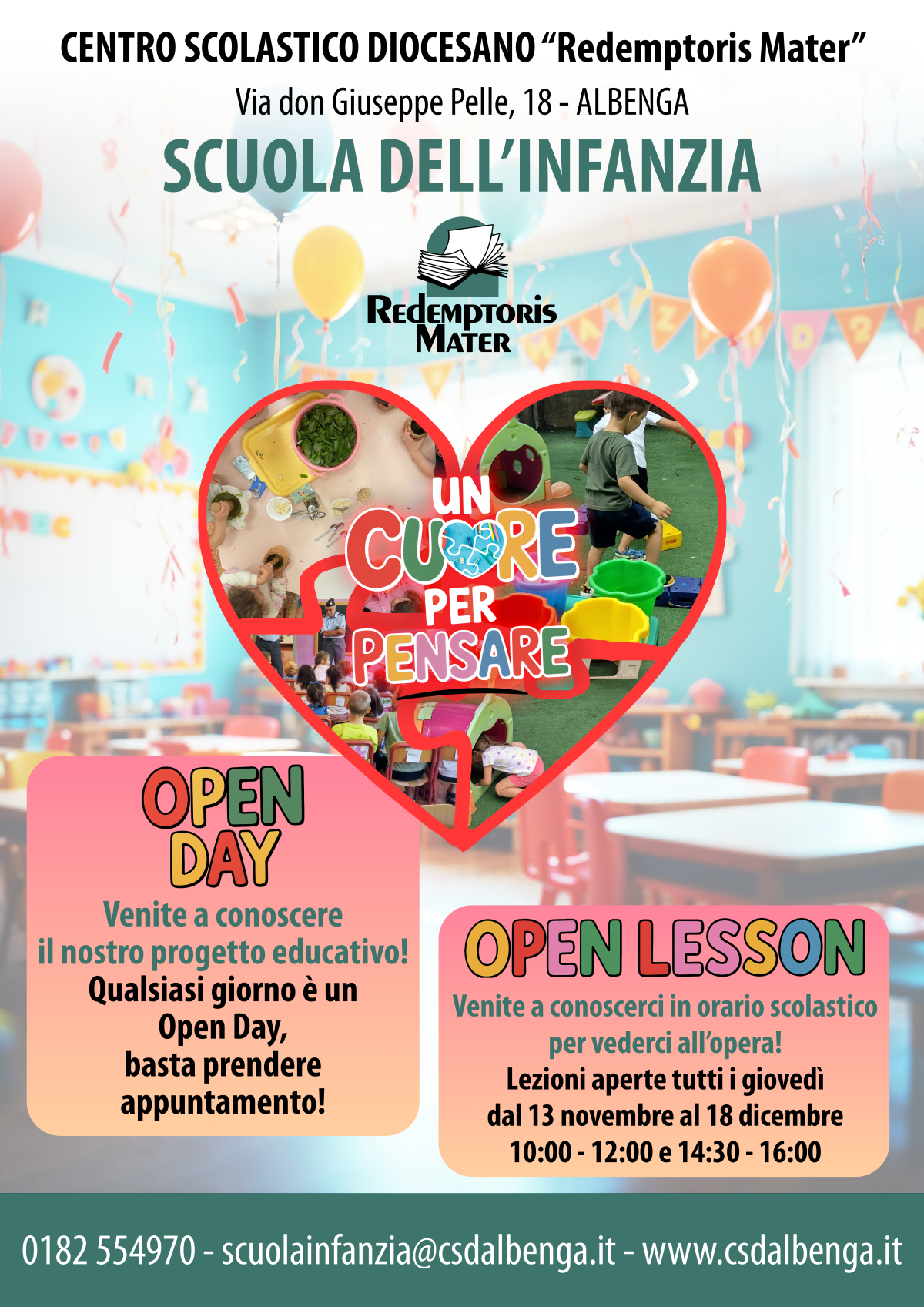 La scuola dell’infanzia san Giorgio, accorpata dall’anno scolastico 2019-2020 al Centro Scolastico Diocesano “Redemptoris Mater”, ha sede presso la Parrocchia san Giorgio, in via don Giuseppe Pelle, 18 – Albenga. Accoglie bambine e bambini di età compresa tra i 3 e i 6 anni.